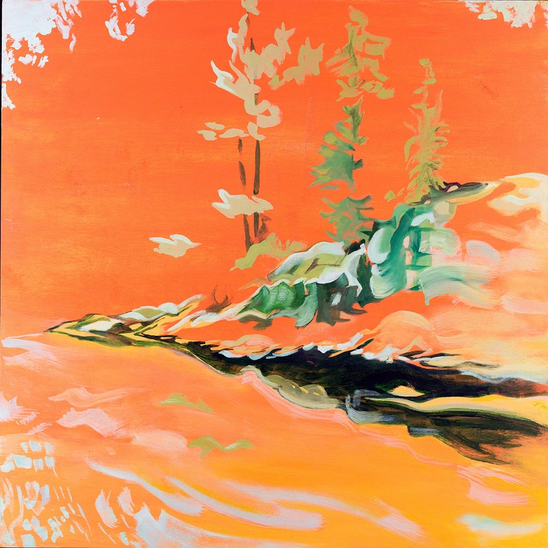 Birth Contemporary Art Modern Minimalist Work Landscape Abstract Surreal Green Graphics And Orange Background Oil Panel Wood